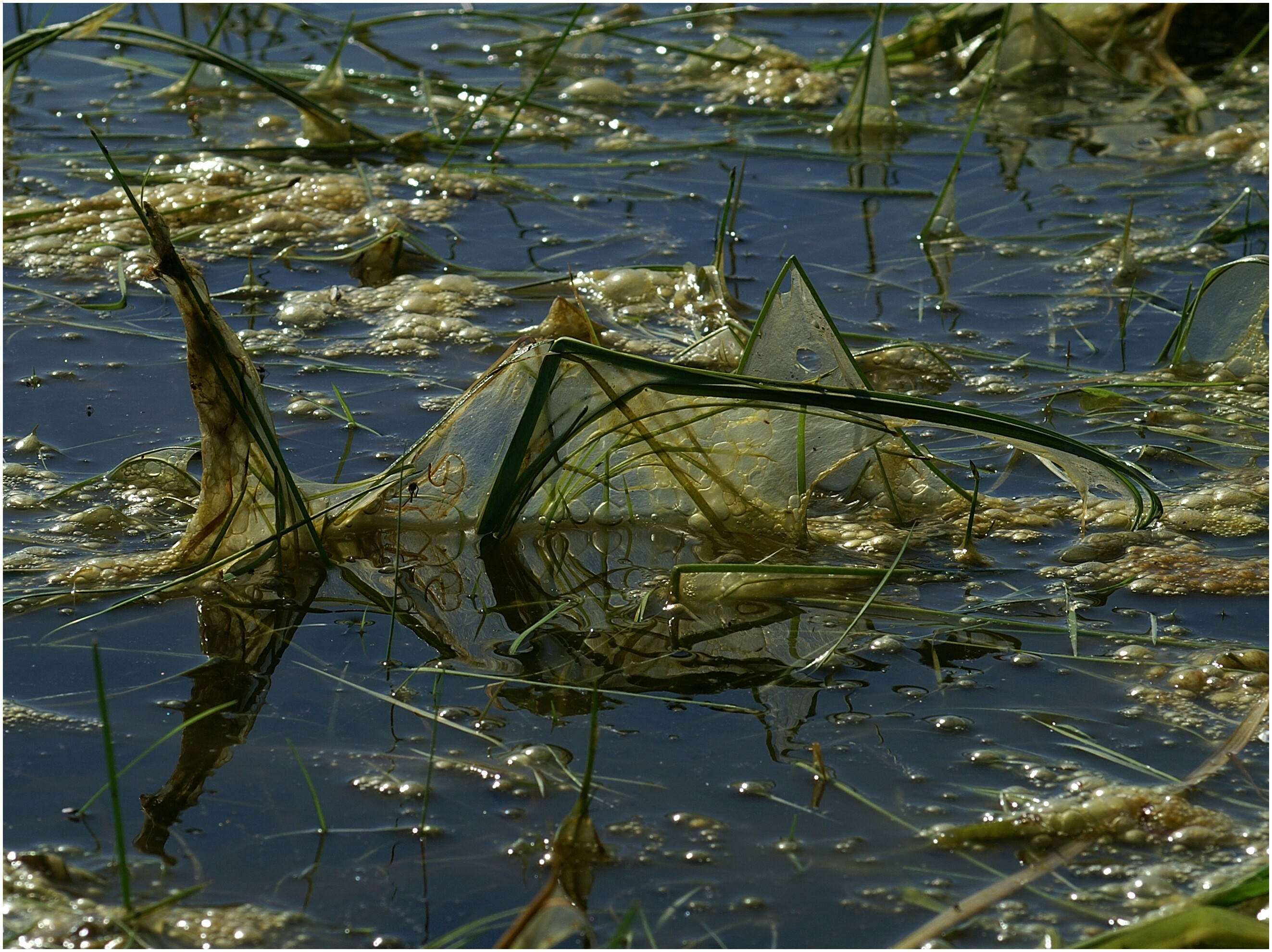 Die überschwemmten Wiesen laufen langsam aber sicher ab und legen die Algen trocken.
