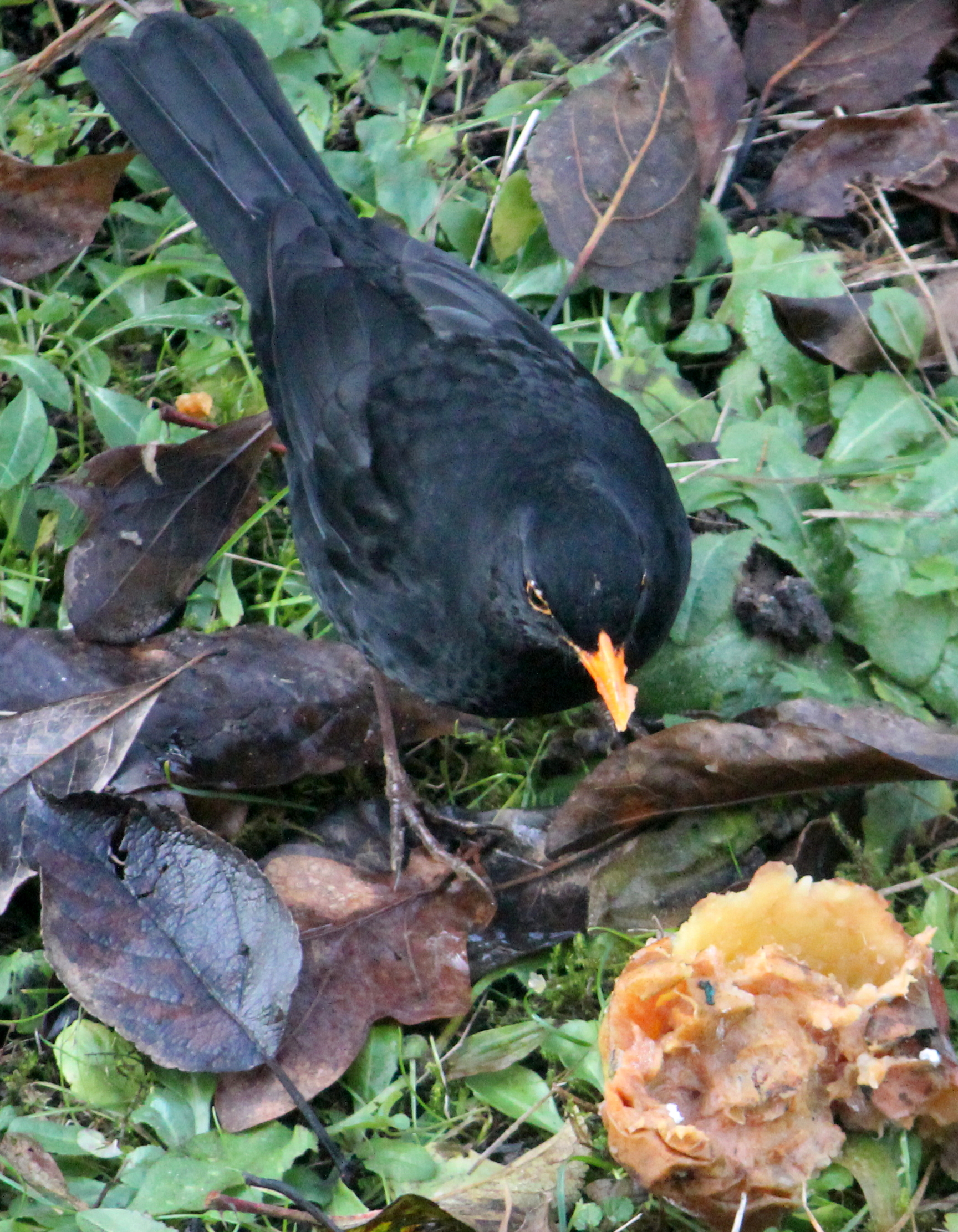 Wir lassen immer einige Äpfel an unserem Baum hängen - Drosseln, aber auch Meisen und Finken nehmen sich ihrer im Laufe des Winters an. Fallobst wird - wie hier- überwiegend von Amseln (und nachts - in milden Wintern wie diesem - von Mäusen) verwertet.