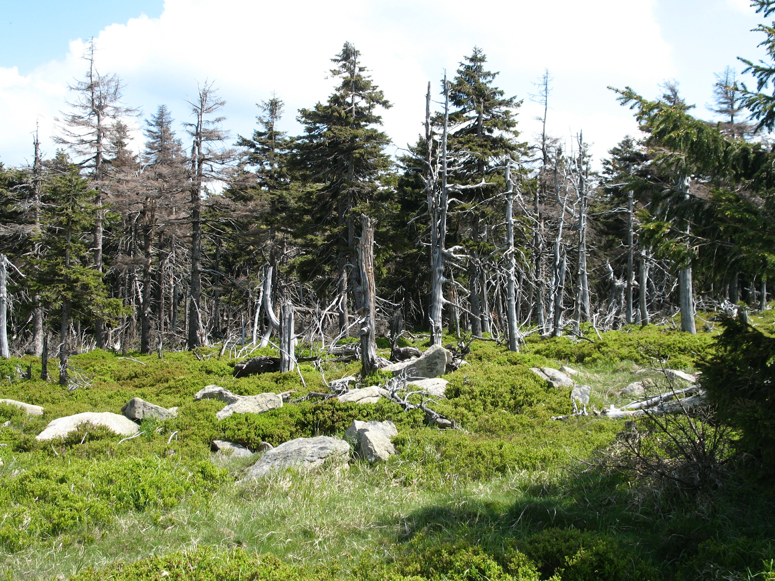 In der Gipfelregion des Brocken sehen wir viel Totholz neben gesunden, vitalen Fichten. Aufnameort: Brocken / Harz, 24.05.2008 Kamera: Canon Power Shot A620 1/320; 4,0; 10,8mm