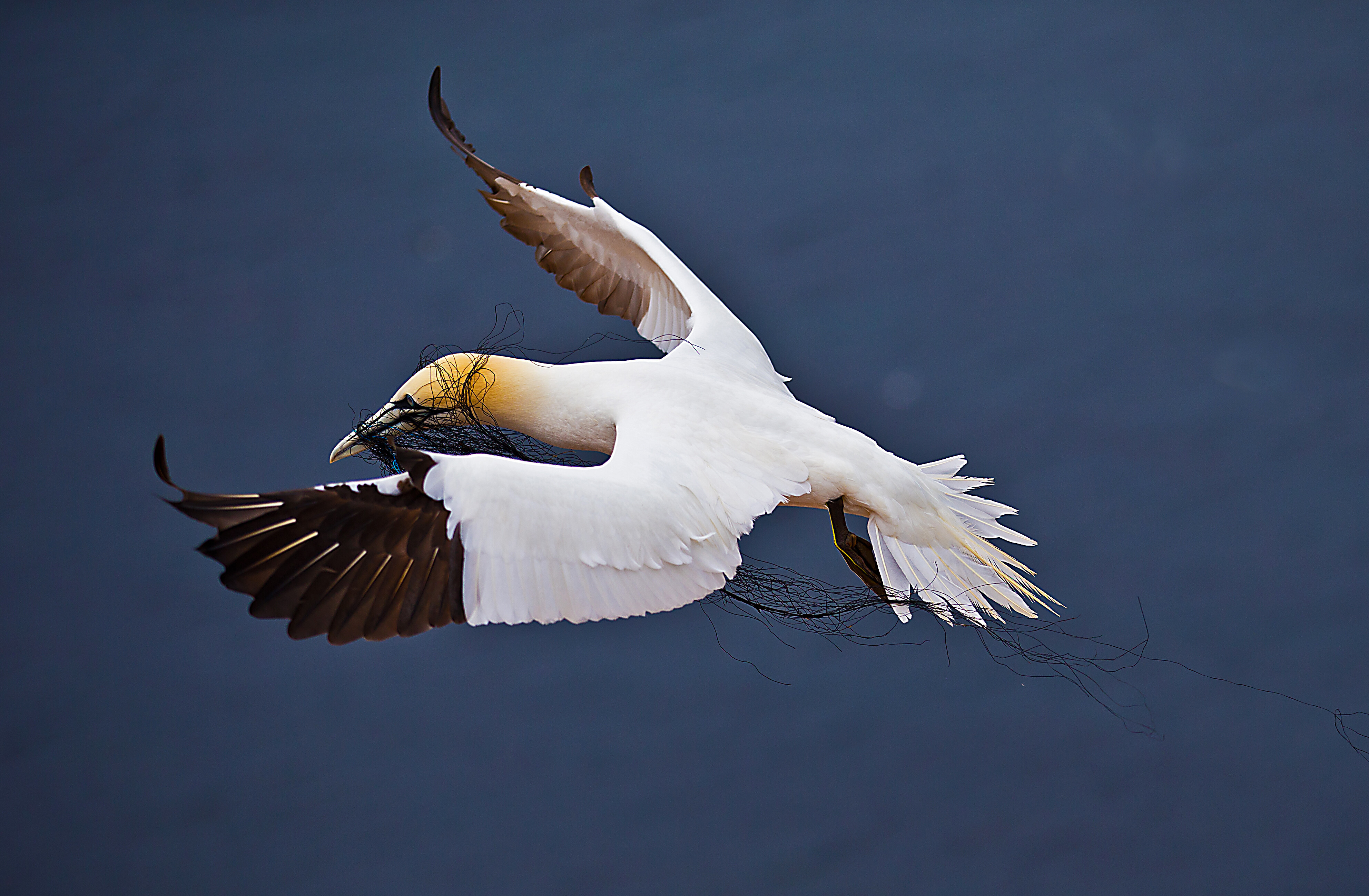 Gefahr durch Fischernetze. Baßtölpel fischen oft für den Nestbau Kunststoffnetzteile aus der See. Viele Vögel haben sich im Nest darin rettungslos verfangen und sind kläglich verendet.