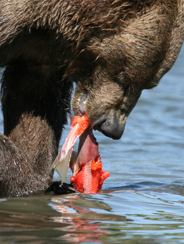 Der erbeutete Lachs wird genüsslich verzehrt. Besonders lecker ist die fettreiche Haut.