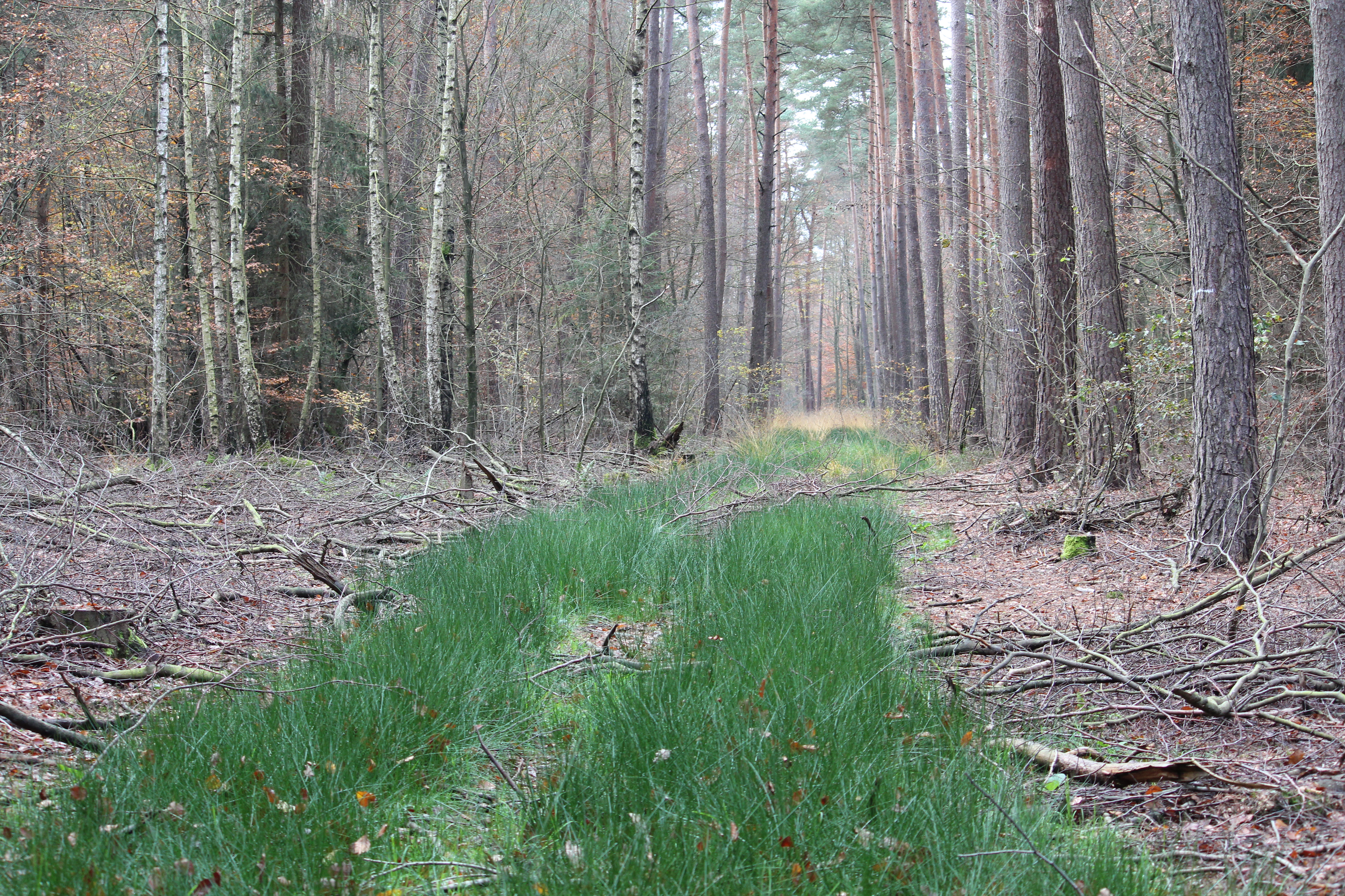 Durch Bodenverdichtung auf den Waldwirtschaftswegen kann dort das Regenwasser nur ser langsam versickern, der Boden bleibt feucht, so dass sich in den Radspuren Flatterbinsen und andere feuchtigkeitsliebende Pflanzen ansiedeln.