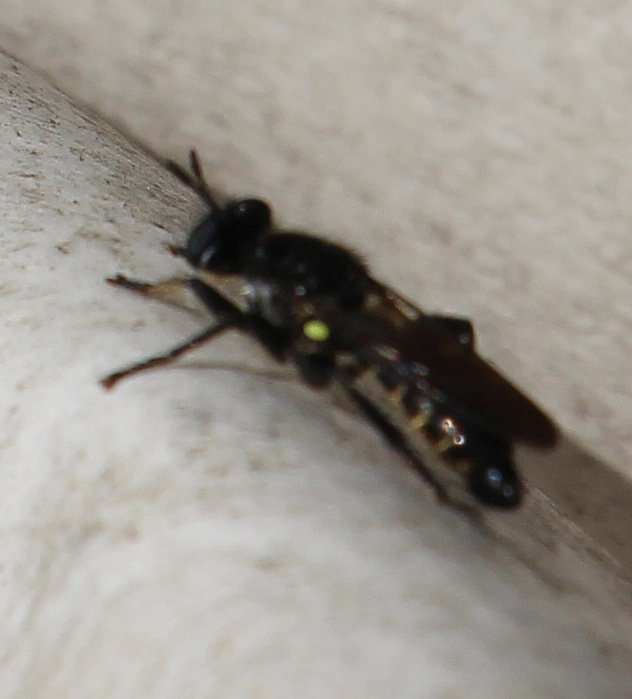 Eine schwarze Raubfliege mit gelben Halteren, die sich gerne in der Nähe von Laub- oder Nadelwäldern von Mai bis August aufhält.