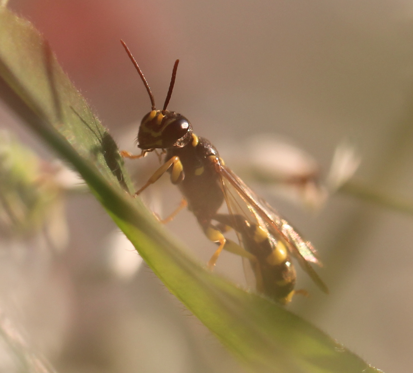 Sie heißt so, weil sie sich bzw. ihre Brut von saprophagen Fliegen ernährt und darum häufig auf Kot - meist Kuhfladen, hier aber wohl Hunde- oder Katzenkot - gefunden wird. Leider waren mir beim Fotografieren einige Pflanzenteile im Weg, so dass der Hinterleib der Wespe verschwommen ist. Trotzdem erkennt man ihre spezifischen Merkmale, so das knotenartige erste Hinterleibssegment.
