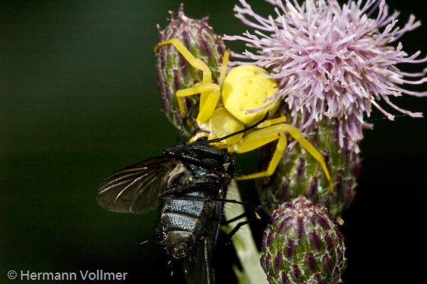 Die Krabbenspinne kann die Fliege nun in Ruhe verzehren. Aufnameort: DEU, BW, Hemmingen Kamera: Nikon D70, Sigma APO-Macro 180/3,5D, Blitz
