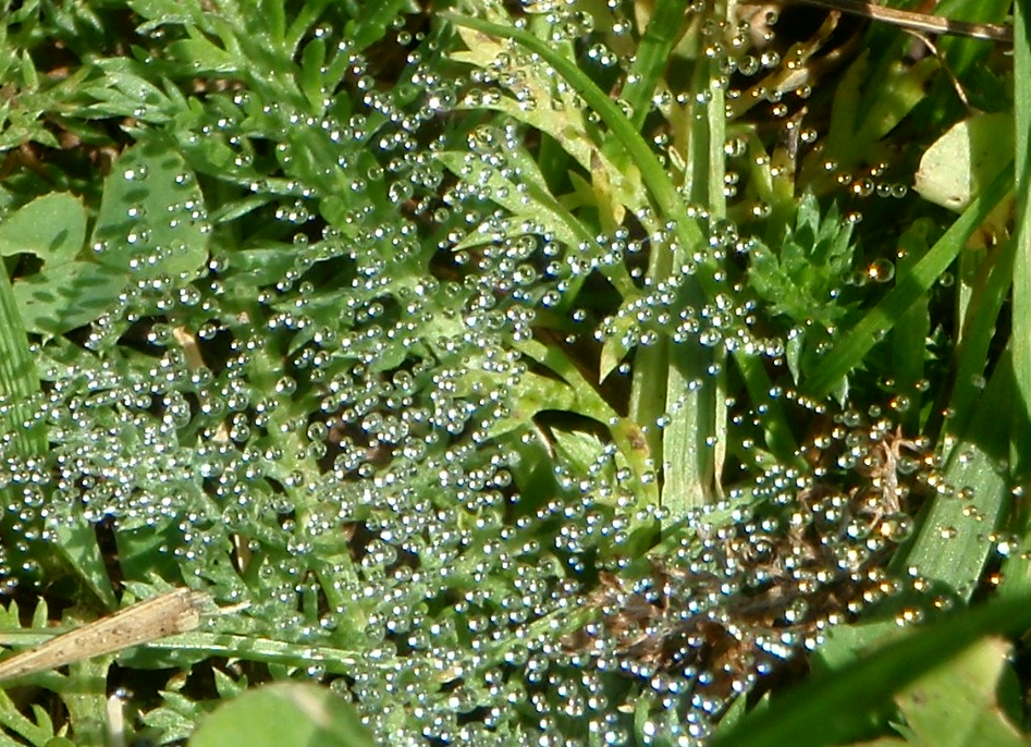 Tautropfen in der Morgensonne scheinen über dem Gras einer Liegewiese am Flussschwimmbad Ramspau zu schweben ... hauchdünne Spinfäden tragen deren enormes Gewicht ohne selber sichtbar zu sein
