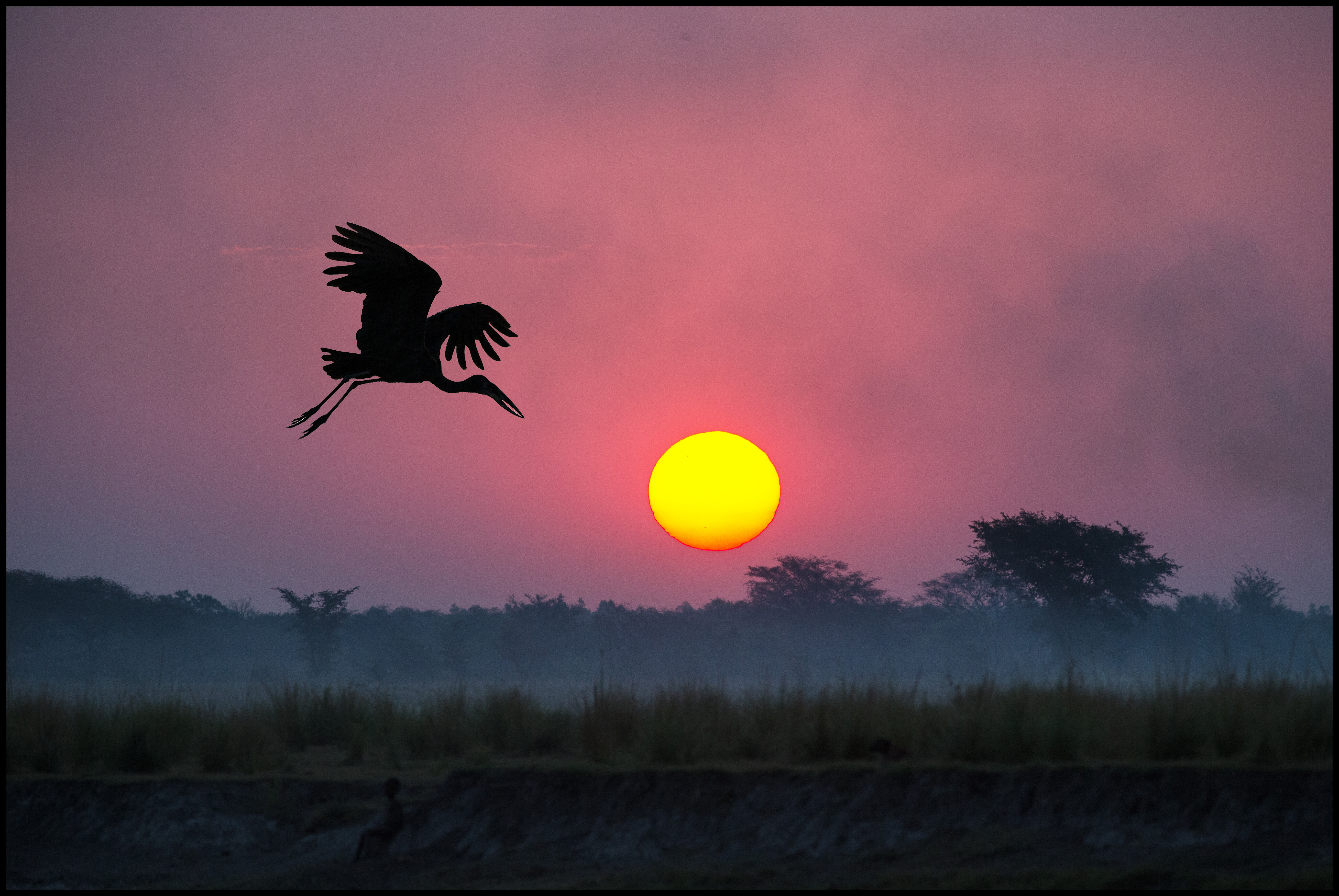 Montage eines fliegenden Klaffschnabels in ein Sonnenuntergangsfoto, was dem Bild einen besonderen Reiz geben soll.