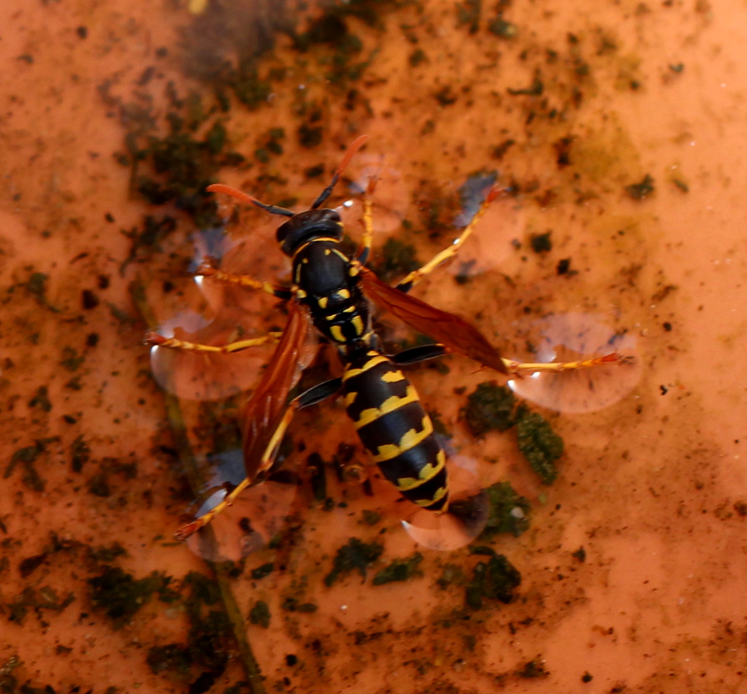 Französische Feldwespe (Polistes dominulus) bei der Wasseraufnahme. Sie ist direkt auf den Wasserspiegel hinabgeschwebt, setzte mit weit ausgebreiteten Beinen und der Hinterleibsspitze auf der Wasseroberfläche auf. Durch die große Auflagefläche verteilt sich das Gesamtgewicht, sodass die Wespe von der Oberflächenspannung des Wassers getrtagen wird. Man sieht sehr schön, wie sich die Wasseroberfläche unter den Tarsen der Wespe einsenkt, aber die Oberfläche wird nicht durchstoßen. Bisher wusste ich nicht, dass Wespen diese Technik beherrschen und zu "Wasserläufern" werden können.