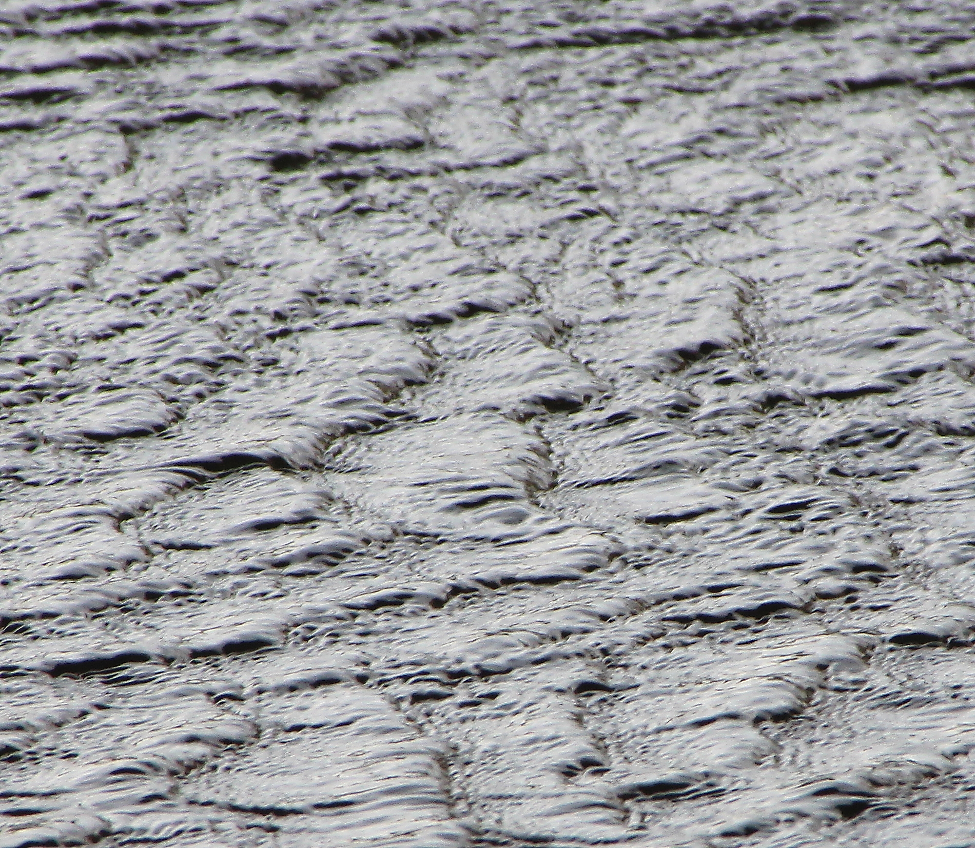 Wenn starker Wind gegen die Strömung gerichtet ist, wird die Wasseroberfläche gegen die Strömungsrichtung zurückgedrückt, es entstehen interessante Wellenmuster.
