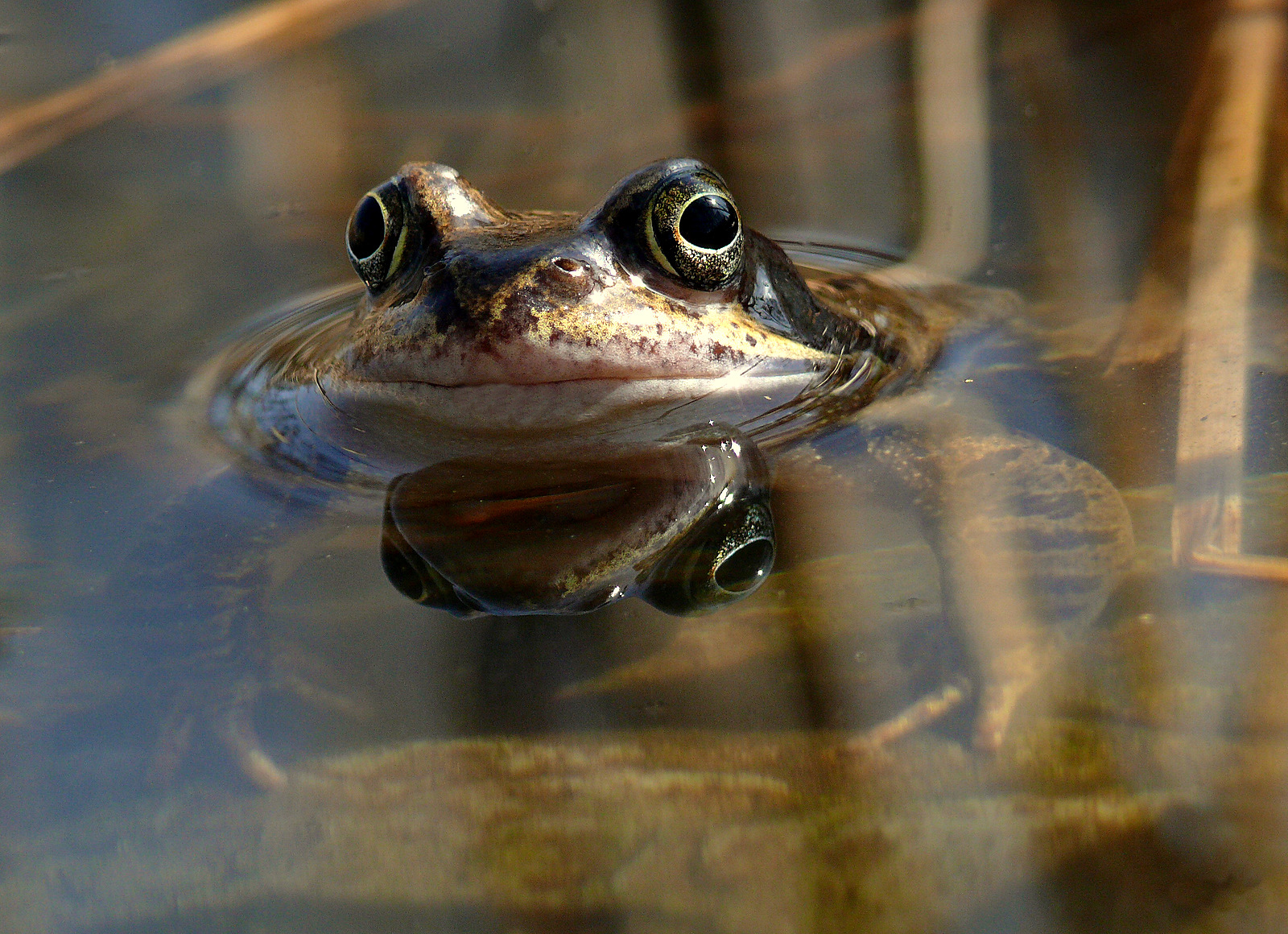 nach anfänglichem Mißtrauen kam der Grasfrosch allmählich immer näher, um zu schauen, da am Teichrand fotografiert. Aufnameort: Ökologisch Botanischer Garten in Bayreuth Kamera: Panasonic Lumix FZ 50